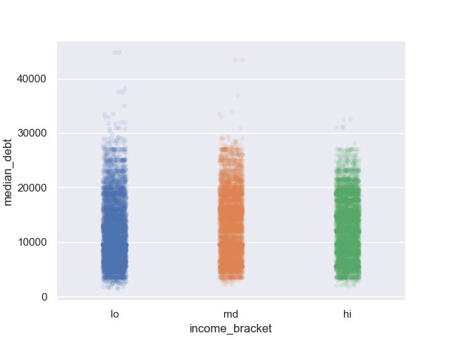 Before constructing the scatterplot, I retrieve only the measures I want: LO_INC_DEBT_MDN, MD_INC_DEBT_MDN, HI_INC_DEBT_MDN. I then use those to create a new dataset where each point has the form (income bracket, debt). I pass this new dataset into seaborn to create the scatterplot, with income as the x-axis and debt as the y-axis. Since the x-axis is categorical, I used a strip-plot – that is, a scatterplot with jitter applied so that we can better see the distribution of data points.
